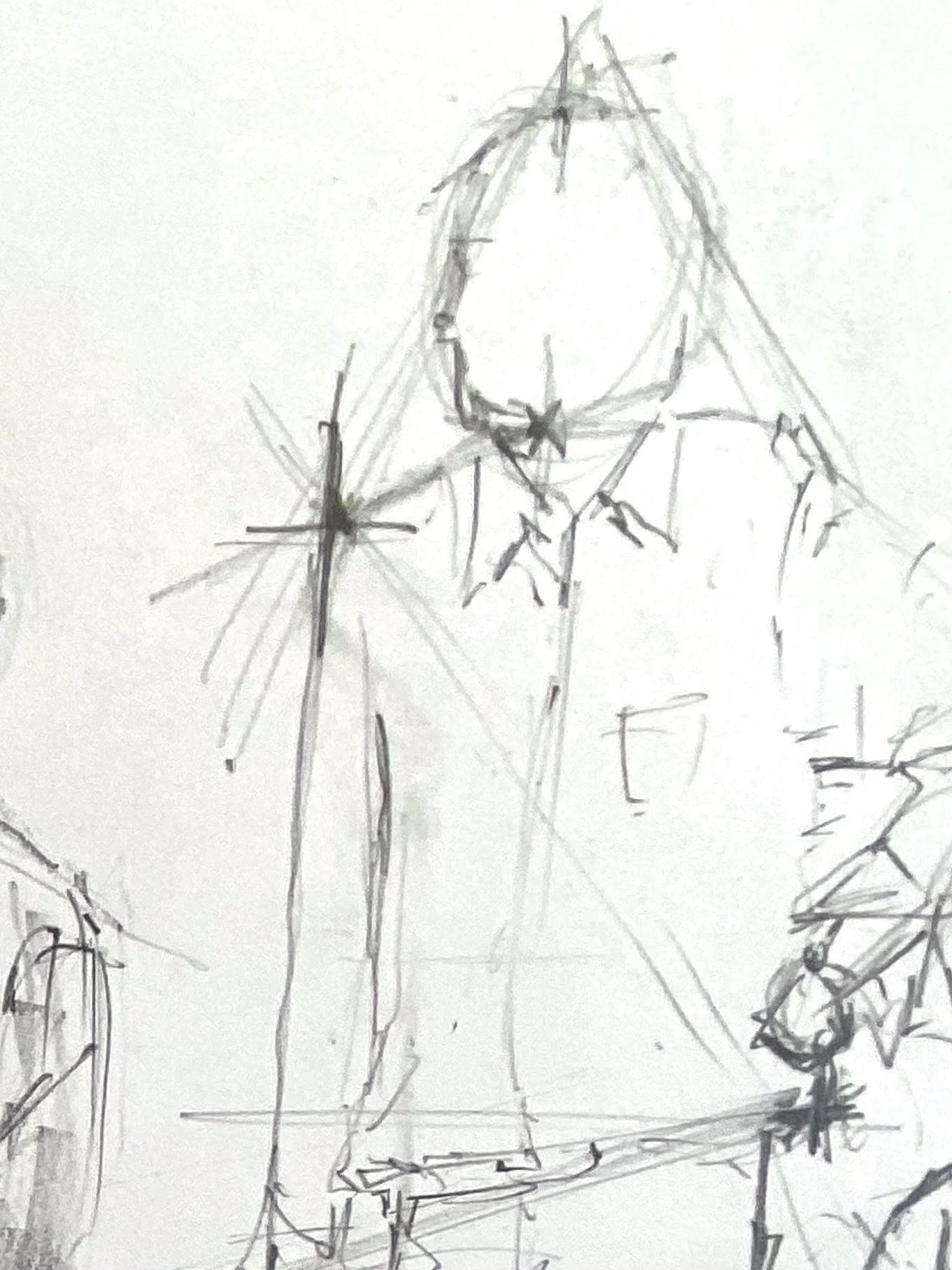 This was a quick exercise in practising triangulation, that is looking at how a point on the subject relates to two other points on the subject. By looking at the angles between them and marking in loose directional lines it became possible to assess where one pointe.g. the top go the head, was in relation to another, e.g. the left hand. It is not finished, it was never intended to be. It is not even that accurate, but that does not matter. These skills improve with practise, this was practise.