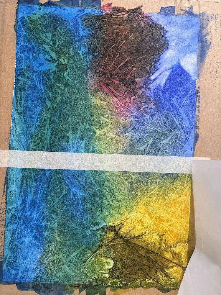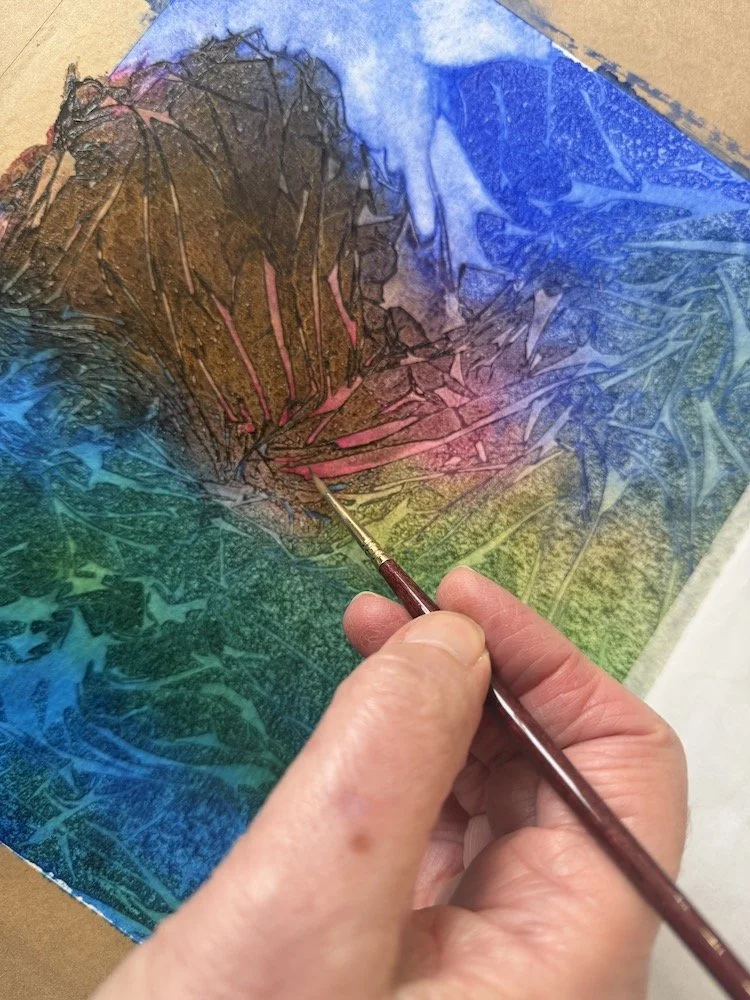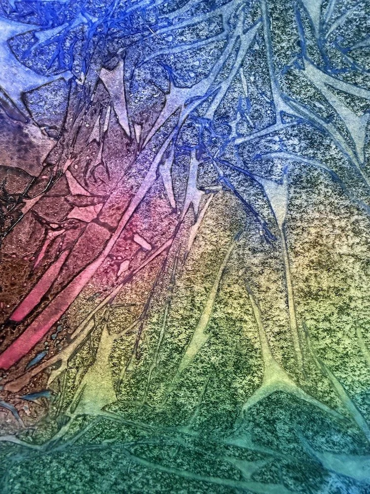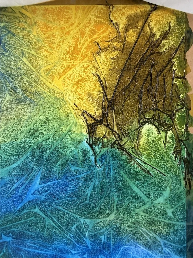 These effects were made by laying clingfilm onto wet watercolour/ink, and watching the textures develop. Adjustments can be made by lifting the edge of the clingfilm and letting paint run along the creases, or afterwards once it has all dried and the clingfilm removed. Great fun!
