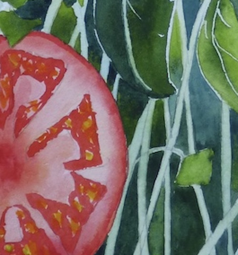 Tomatoes and Basil. Siân Dudley. Watercolour